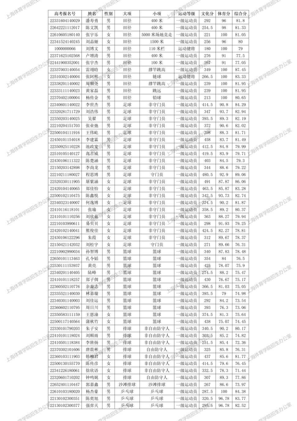 2、2022年上海体育学院运动训练、武术、民族传统体育专业录取非本市学生名单